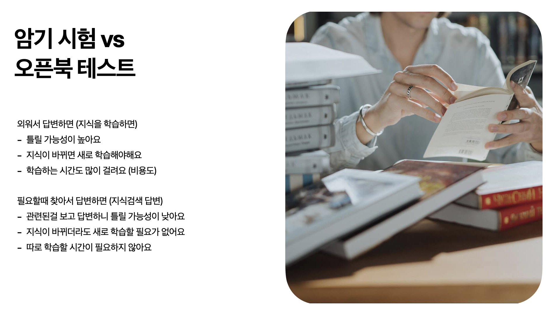 참고로 알프는 지식을 ‘암기’하지 않습니다. 알프와 다른 AI 챗봇의 차이점이기도 한데요. 그냥 시험과 오픈북 테스트를 비교해 보죠. 지식을 암기해서 시험을 치면 틀릴 수도 있고, 내용이 바뀌면 새로 공부를 해야 하고, 시간도 더 들어요. 그런데 오픈북 테스트라면 틀릴 일도 없고, 내용이 바뀐다고 새로 공부해야 할 일도 없고, 시간도 절약할 수 있겠죠. 이렇게 AI가 지식을 암기하지 않고 필요할 때마다 찾아서 쓰는 방식을 RAG라고 합니다. 저희는 고객센터 AI에 RAG가 훨씬 적합하다고 생각했어요.