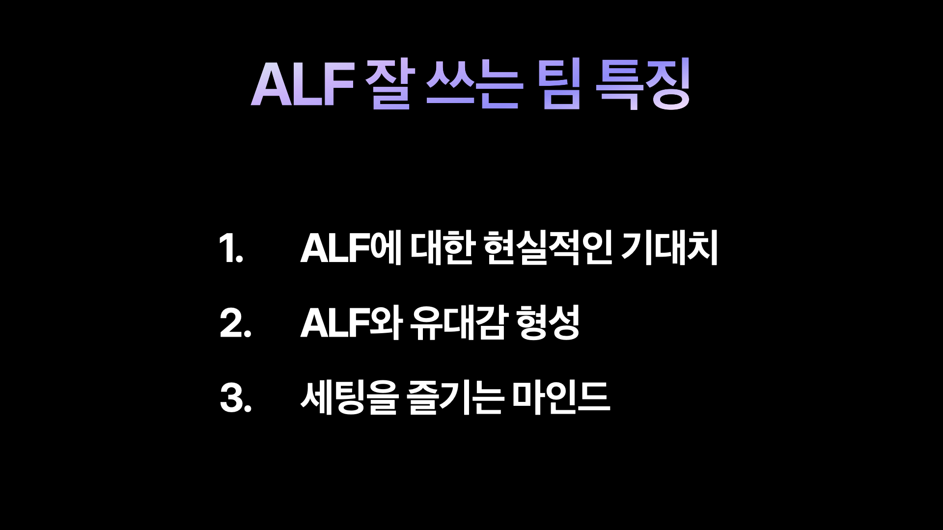 AI를 잘 쓰는 팀들을 보면, 우선 AI에 대한 기대치가 현실적이었습니다. 다 되지 않는다는 걸 알고 있었고, 사람처럼 교육이 필요하다는 걸 알고 있었어요. 무엇보다도 알프와 유대감을 형성하시더라고요. 답변을 잘하더라, 기특하더라. 오늘은 좀 실수가 있었다. 이 정보를 추가했더니 정확도가 올라갔더라. 이런 재미를 느끼시는 분들의 경우 알프가 금방 고도화되면서 성과도 확실하게 나왔습니다.