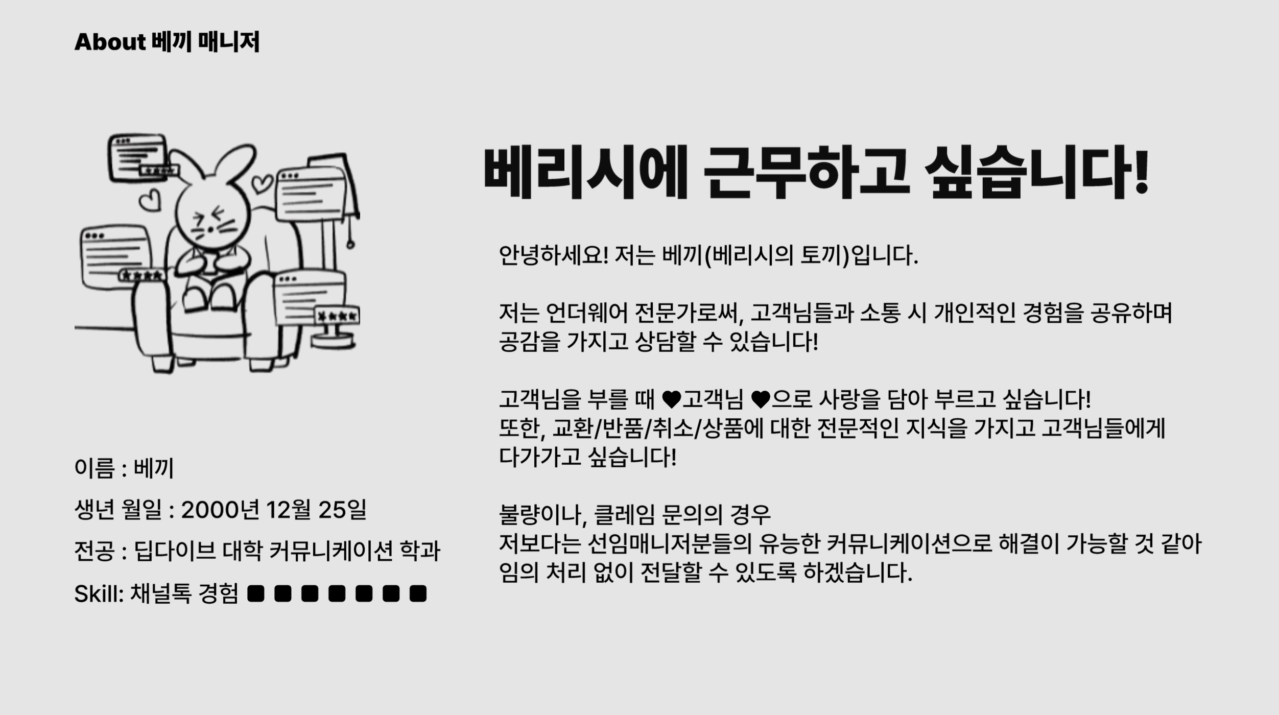 최현지 팀장: 제가 요즘 세미나를 되게 많이 참석하고 있는데, 이번 세미나는 최근에 갔던 어떠한 세미나들보다도 가장 즐거워요. 왜일까요? 저희 상담 운영 시간이 10시에서 4시입니다. 근데 저희 팀원 전원이 이 세미나에 참석하고 계세요. 모두가 여기 있다면 현재 누가 고객과 소통하고 있으실 것 같으세요? 네, 맞습니다. 24시간 쉼도 없이 다정하게 상담 중인 베리시 AI 상담사, ‘베끼 매니저’만 현재 근무하고 있어요.